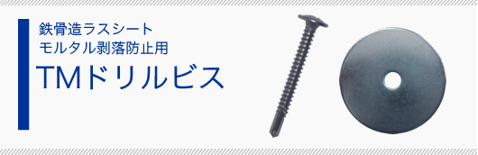 タケモル・ラスモルタル補強工法に使用するドリルビスで、ステンレスSUS410鋼より出来ています。TMワッシャーとの併用により、鉄骨造建築物のラスシートモルタル外壁の剥落を防止します。異種鋼材と接することで発生する電蝕を防止する表面処理がされています。