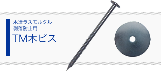 タケモル・ラスモルタル補強工法に使用する木ビスで、ステンレスSUS410鋼より出来ています。TMワッシャーとの併用により、木造建築物のラスモルタル外壁の剥落を防止します。モルタルに接する箇所はネジ切りがないため、強度が増しています。